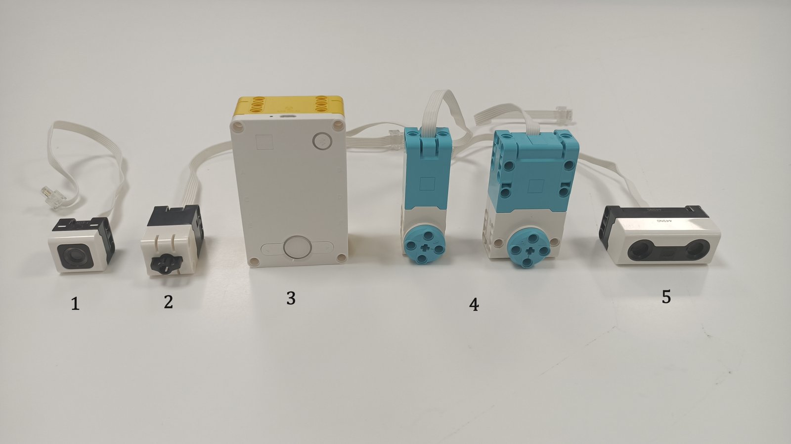 Ci-contre, vous trouverez un exemple d'utilisation des composants mentionnés précédemment sur un robot. Il est équipé d'un capteur de distance, de bras mécaniques reliés à deux moteurs distincts, ainsi que d'un capteur de couleur. Dans cette configuration, le capteur de distance détecte un objet dès qu'il se trouve à une distance inférieure à 4cm, déclenchant ainsi le mouvement des bras. Le capteur de couleur, placé à l'avant et orienté vers le bas, est utilisé pour suivre un tracé. Le tout permet au robot d'attraper un objet qui se trouve sur son chemin et de le garder tout en étant en mouvement.